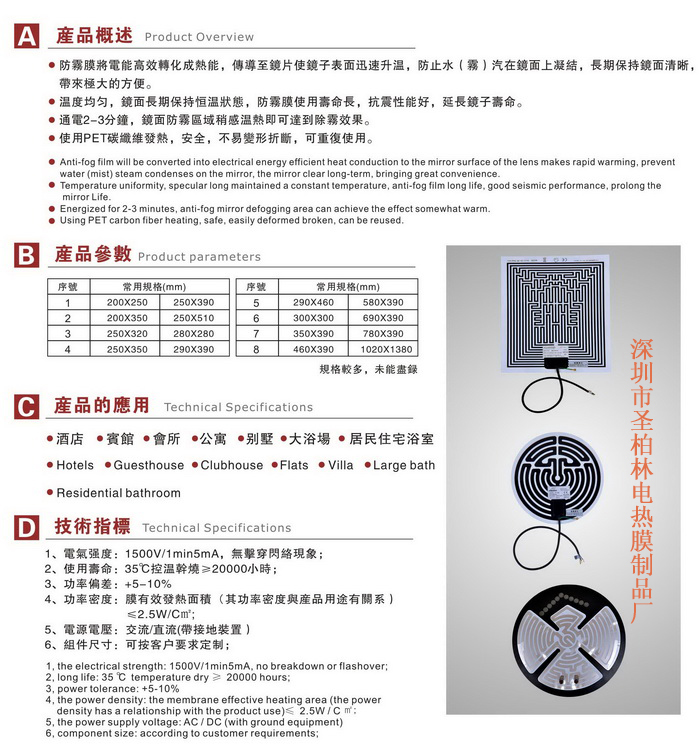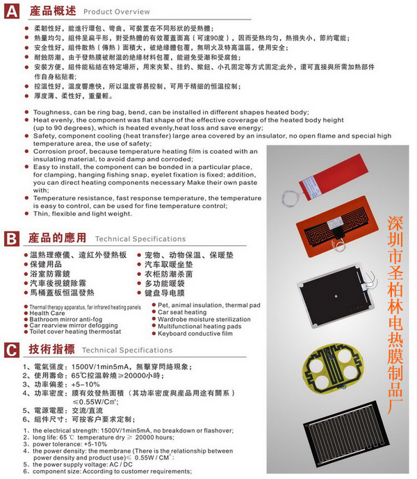 3、形狀及大小極其靈活,尤其適合于制作面積極小的柔性電熱膜元件。