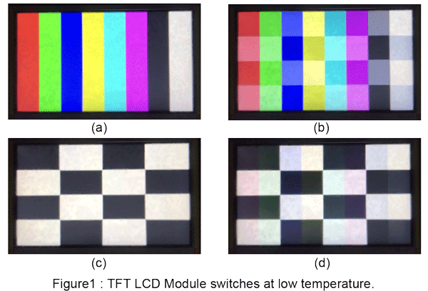 參見圖1(a),它顯示了切換前的穩定彩色屏幕。然后,切換后將變為圖1(b)。這種重疊的情況是由于LC的物理特性導致其在低溫下緩慢轉動。片刻后,重疊的屏幕將變得清晰;但是,您仍然可以看到下面的陰影,如圖1(c)所示;圖1(d)是切換后的最終結果。