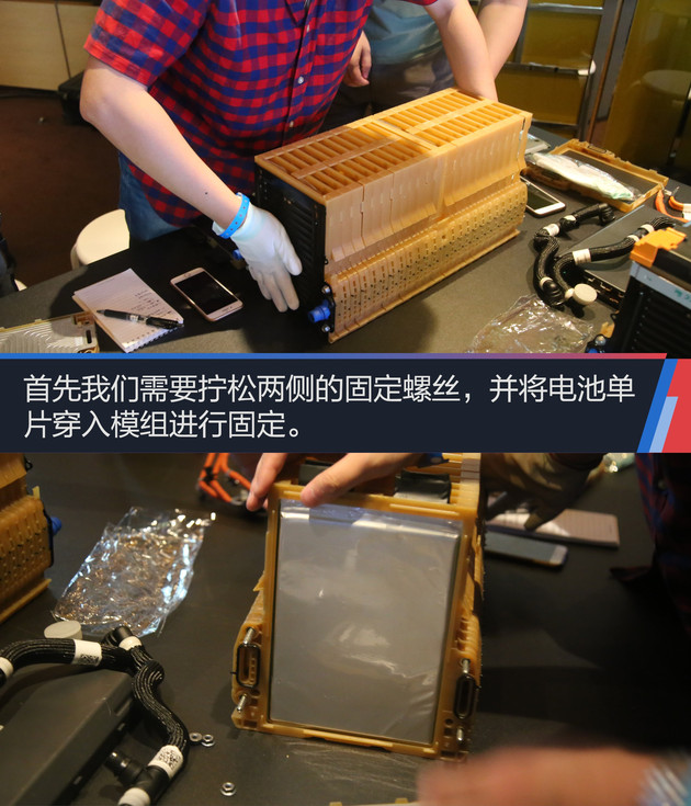 隨后,我們還得到了自己動手組裝電池組的機會。此次的電池單元來源于即將上市的別克VELITE 6的插電式混合動力電池包。我們將在工程師的指導下進行簡單的安裝。