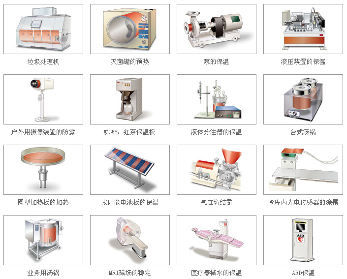 可運用在電器盒除濕、杯類加熱、 IC晶圓加熱、食品保溫袋產品、水床加熱器、電熱衣架、毛巾箱、干燥箱、汽車擋雪電熱片、機車把手、美容瘦身電毯、睫毛器….等。
