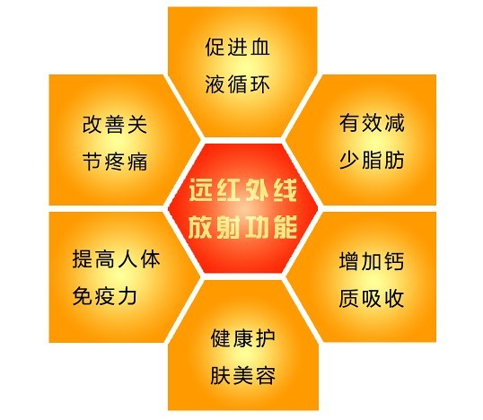 生命科學研究證實,人體本身是一個遠紅外輻射源,他可以吸收及發射遠紅外光,所以當遠紅外線照射人體時,其頻率與身體中的細胞分子及原子間的水分子運動頻率相一致,引起共振效應,其能量最高且能被生物體所吸收,如同曬太陽一樣,能有效促進血液循環和新陳代謝使皮下組織深層部位的溫度升高,產生的熱效應,使水分子活化,處于高能狀態,加速人體需要的生物酶的合成,同時活化蛋白質等生物分子,從而增強機體免疫力和生物細胞的組織再生能力,加速養分和酵素的供給,促進身體健康。